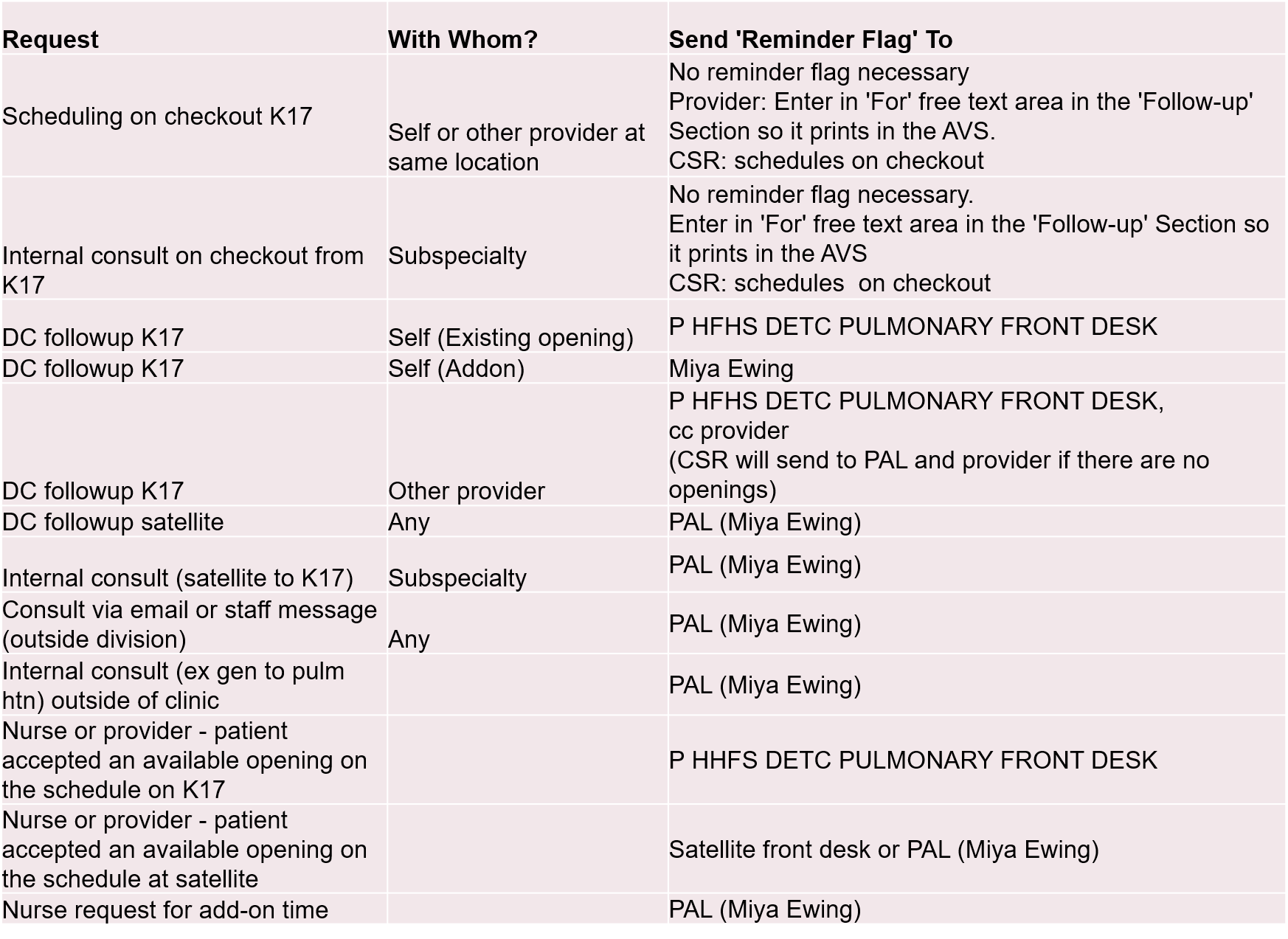 Scheduling patients for a pulmonary clinic follow up Last Updated: August 15, 2018 by Michael Lazar (Originally posted on: August 14, 2018Per clinic policy, the following chart should aid providers on who to contact regarding pulmonary clinic follow up visits Facebook Twitter LinkedIn