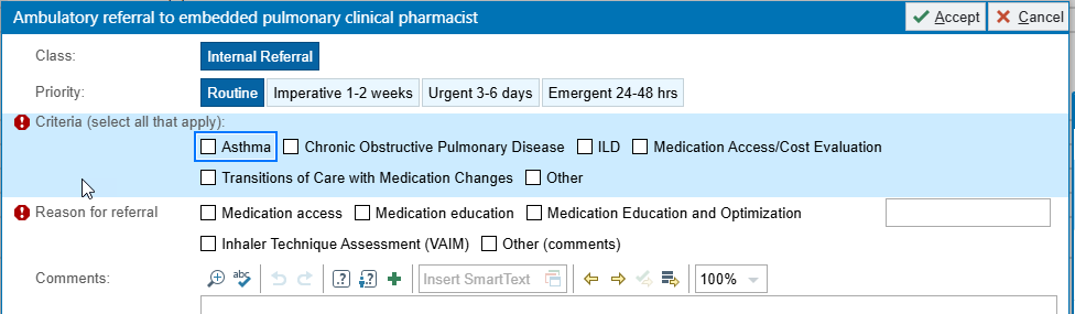 This order will allow you to select criteria regarding priority, criteria, and reason for referral: