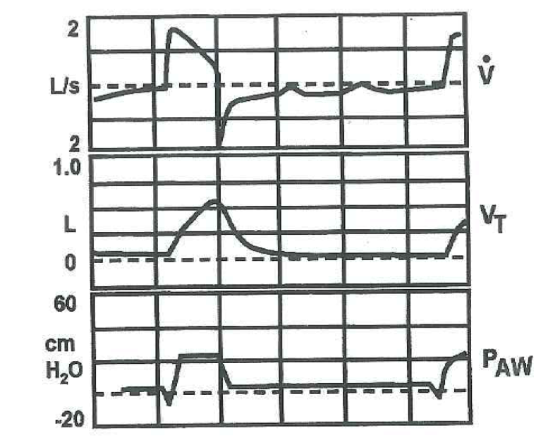 A 56 yo man with COPD has been receiving mechanical ventilation using volume assist control for the last 36hrs. His settings are: TV 6mL/kg RR 24 FiO2 0.4 PEEP 5. His ABGs have improved to: PO2 82mmHg, PCO2 42mmHg pH 7.37 and you switch him to a pressure support mode to provide a comparable tidal volume. However, he quickly becomes dyspneic. His ventilator graphics are shown.